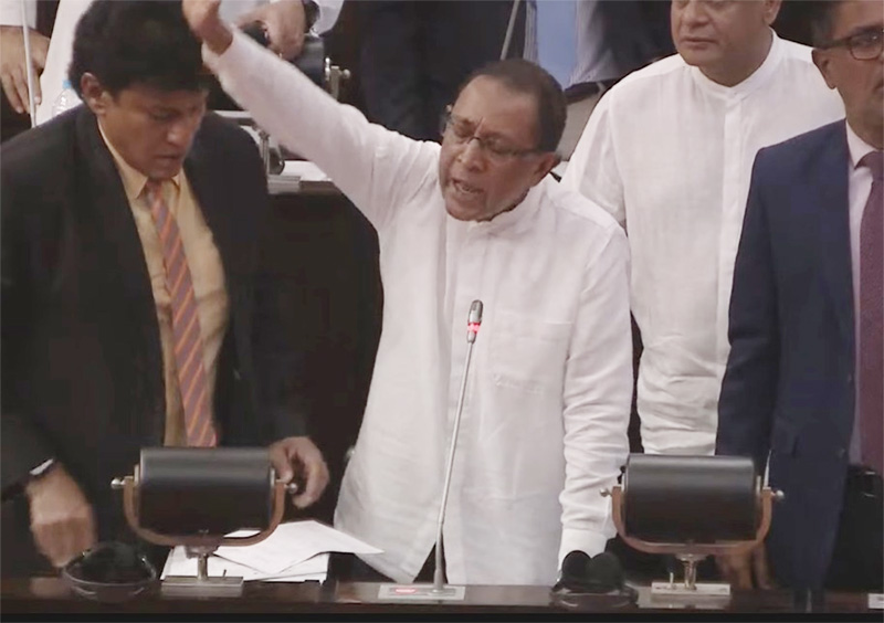 A stormy scene unfolded in Parliament yesterday as the Opposition staged a walkout, accusing the government of blocking a debate on urgent policy measures, amid the worsening disaster situation. It claimed the government had ignored a warning of the Ditwah cyclone.